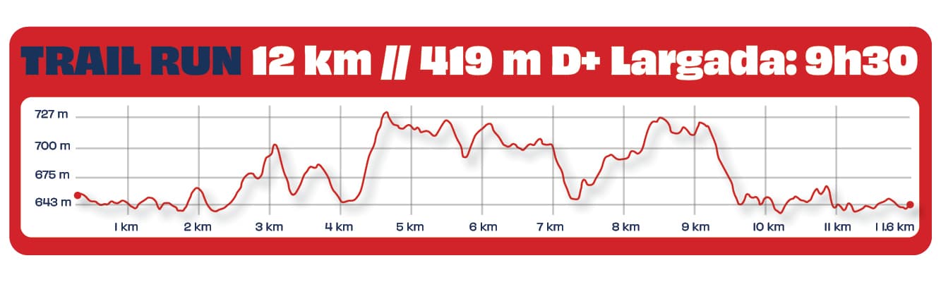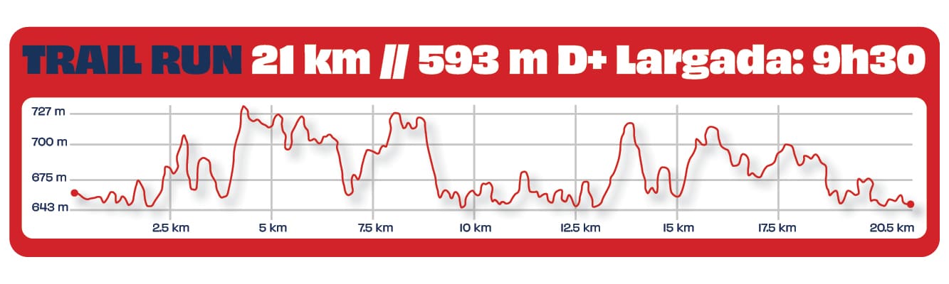 TRAIL RUN: 6KM, 12KM, 21KM E 42KM, COM SINGLE TRACKS. UPHILL: CERCA DE 4KM E MUITA ASCENSÃO. CANICROSS: PARA HUMANOS E CÃES CURTIREM 5KM DE TRILHAS.